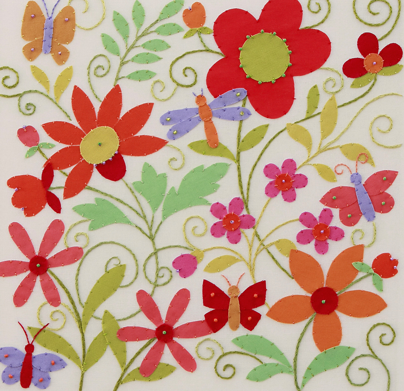This has really been fun; I love designing floral images in a decorative style. This one is an appliqué with embroidery and bead work. The hands on aspect of creating with fabric is always thrilling for me. This image started out with a simple feel to it, and became more ornate as I continued piecing it together. My clients have sought out this look from me for a variety of products, including gift wrap, gift bags, textiles and scrap-booking paper.